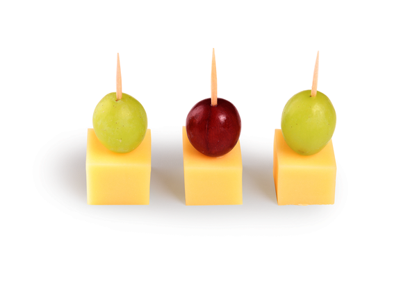 Aromatische Käsewürfel mit Trauben garniert.