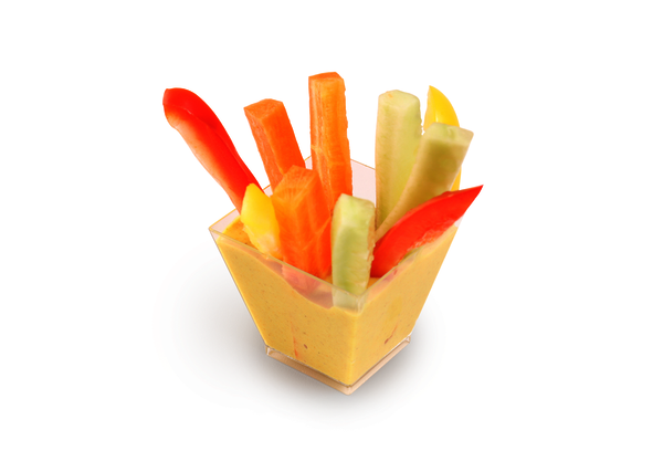 Peperoni, Gurke und Rüebli, dekorativ im Becher mit Sauce angerichtet.